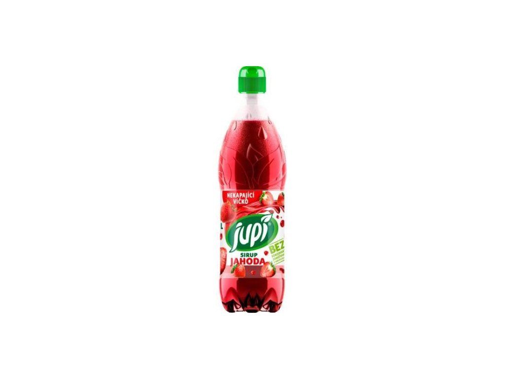 Jupí sirup jahoda 0.7L .cukr, glukózo-fruktózový sirup, voda, jahodová šťáva z koncentrátu (1 %), kyselina: kyselina citrónová, antioxidant: kyselina L-askorbová; aroma; rostlinný koncentrát (mrkev), barvivo: amoniak-sulfitový karamel, konzervant: sorban draselný.