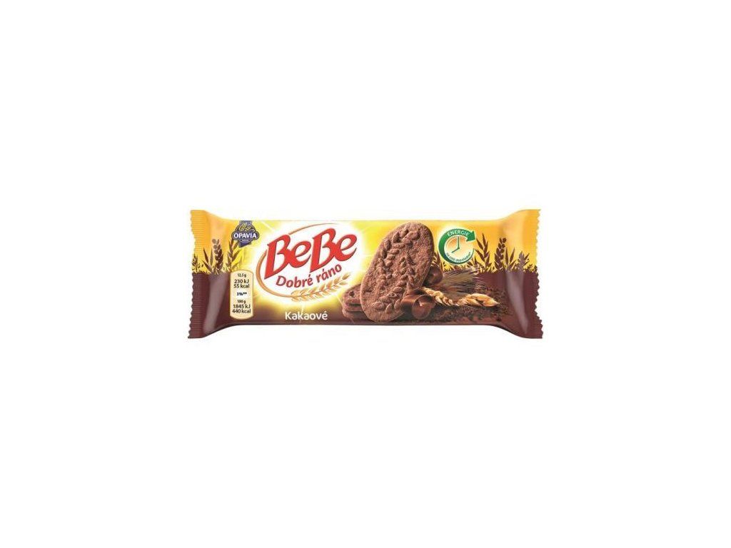 Opavia bebe kakao 50gCereálie 56,6 % [celozrnné cereálie 38,5 % (celozrnná pšeničná mouka 19,4 %, ovesné vločky 8,5 %, celozrnná ječná mouka 6,2 %, celozrnná žitná mouka 3,4 %, celozrnná špaldová mouka (pšenice) 1 %), pšeničná mouka 18,1 %], Cukr, Čokoládové kousky 12,3 % [cukr, kakaová hmota, rostlinné tuky (palmový, bambucký v různém poměru), dextróza, kakaové máslo, emulgátor (sójový lecitin)], Řepkový olej, Kakaový prášek se sníženým obsahem tuku 3 %, Pšeničný škrob, Kypřicí látky (hydrogenuhličitan amonný, dihydrogendifosforečnan sodný, hydrogenuhličitan sodný), Směs minerálních látek (uhličitan vápenatý, uhličitan hořečnatý, elementární železo), Emulgátory (E492, sójový lecitin, E472e), Jedlá sůl, Sušené odstředěné mléko, Aromata